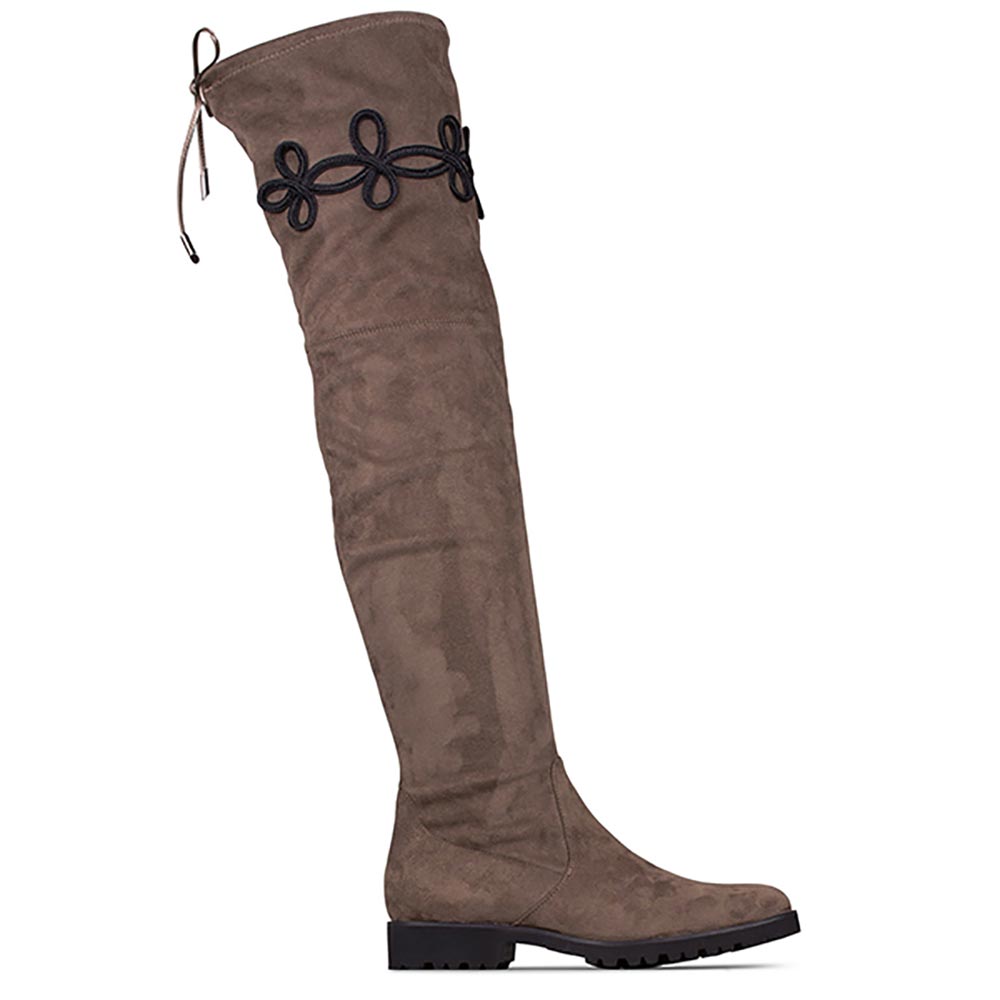 Γυναικεία μπότα, που φτάνει πάνω από το γόνατο, της εταιρείας evaluna,σχέδιο 1860.Είναι κατασκευασμένη στην Ιταλία από ύφασμα σουέντ με τακούνι ύψους 3 cm. Σουρώνει στο πάνω μέρος.