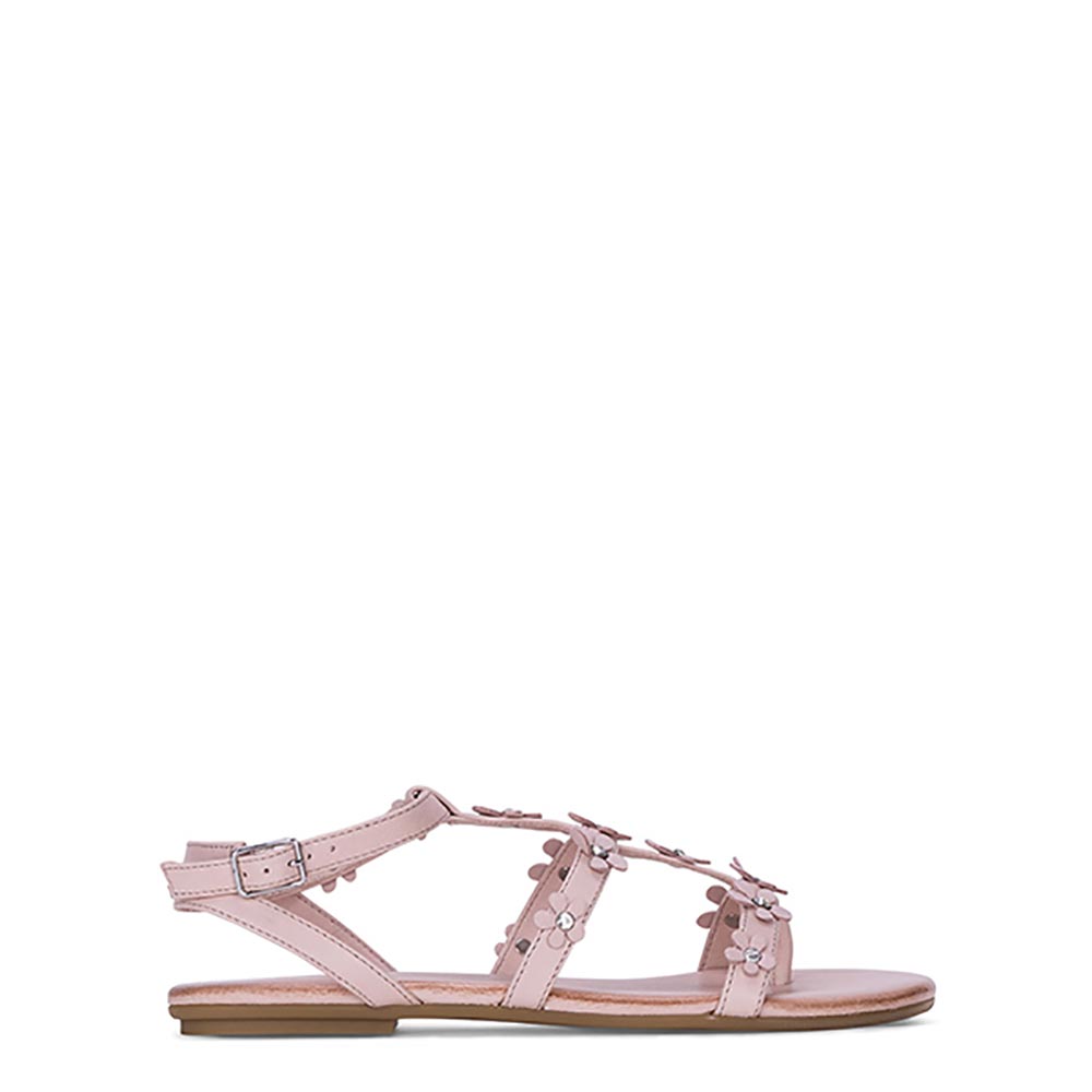Γυναικεία πέδιλα της εταιρείας Inuovo shoes από μαλακό δέρμα και διακοσμητικά λουλούδια από δέρμα και πέτρες. Κλείνει με μεταλλική αγκράφα στο πλάι.