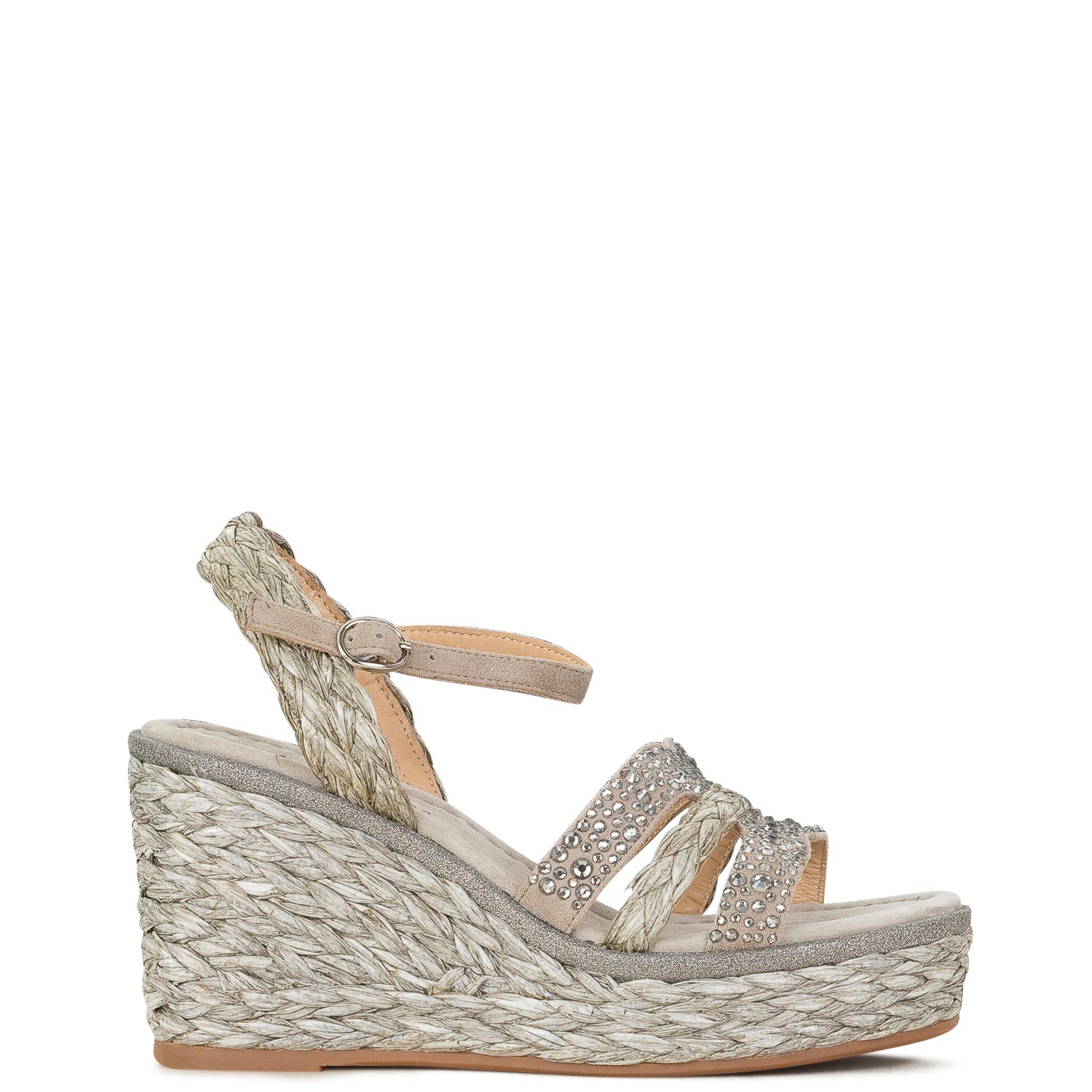 Πλατφόρμες της εταιρίας Alma en Pena για την γυναίκα. Είναι Φτιαγμένα απο δέρμα Kαστόρινο /ψάθα / πέτρες rhinestones εξωτερικά, δέρμα Kαστόρινο εσωτερικά και λάστιχο στην σόλα τους. Εχουν τακούνι 10cm και φιάπα 4 cm.